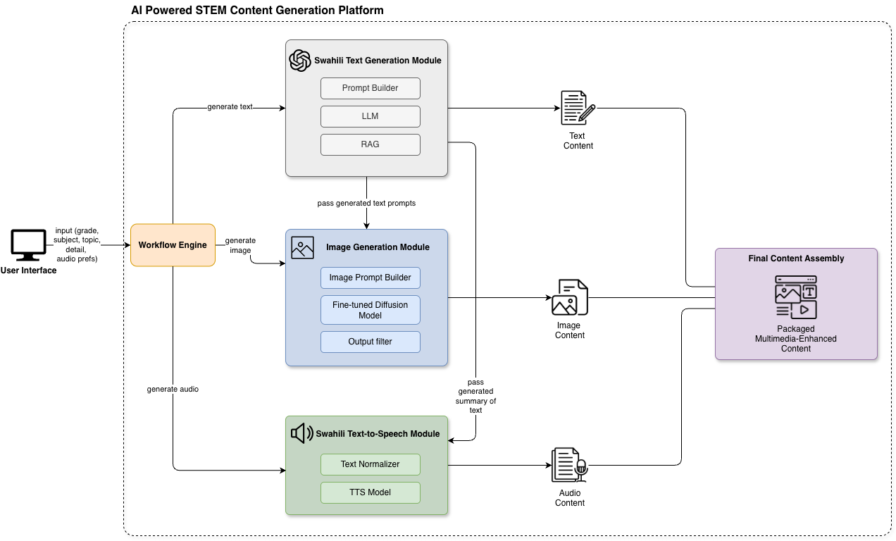 This system architecture is based on research conducted at the University of Dar es Salaam, advancing AI applications for educational equity in low-resource language contexts.